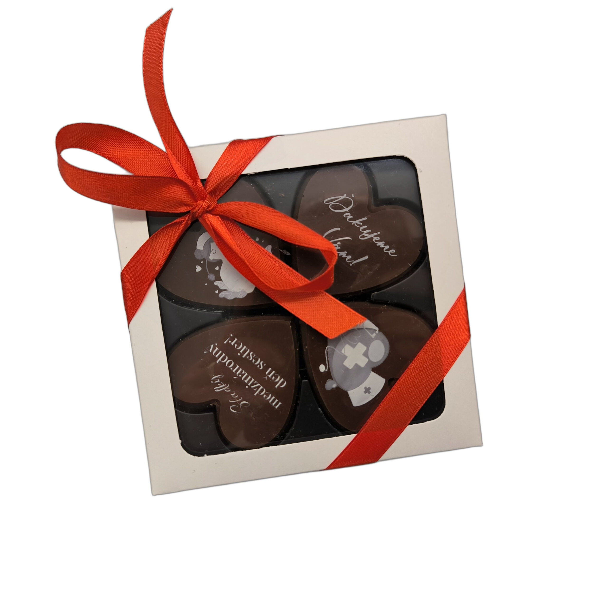 V elegantnom balení nájdete štyri ručne vyrábané čokoládky v tvare srdiečka, z mliečnej, bielej alebo horkej čokolády. Každé srdiečko je potlačené jemným motívom, a ďakovným textom.