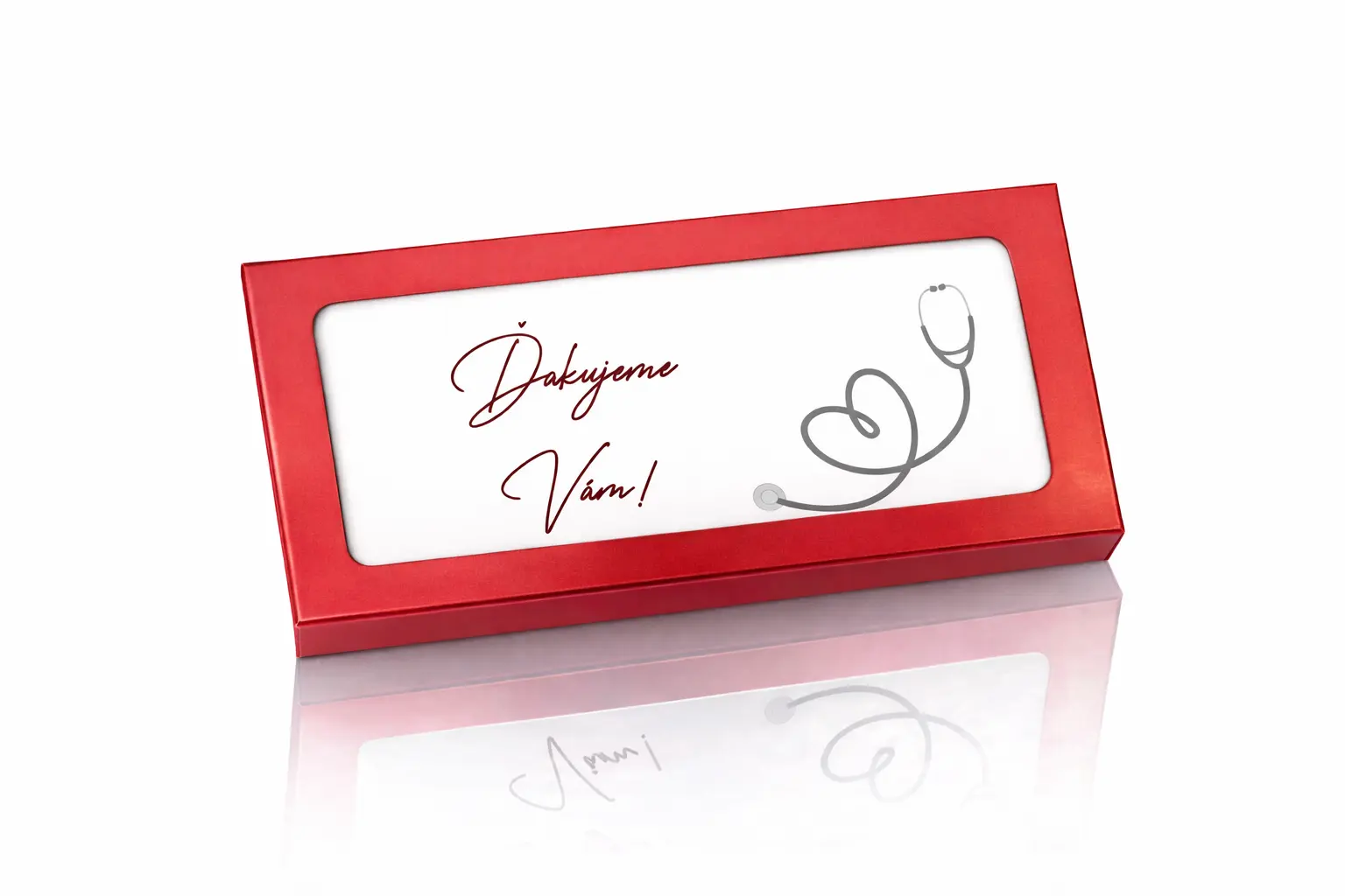 Priamo na čokoládovej tabličke je napísaný ďakovný text. Tablička je zabalená v elegantnej darčekovej škatuľke.
